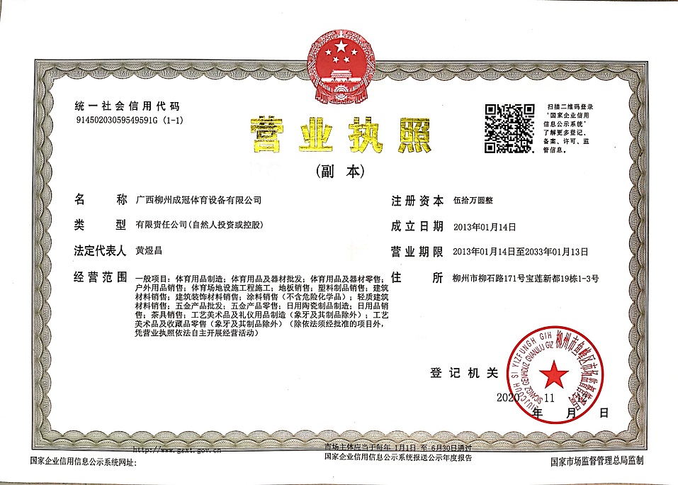 柳州成冠体育设备有限公司 电话:0772-7502351 传真:7261516 手机:13457200027 地址:柳州市柳石路171号